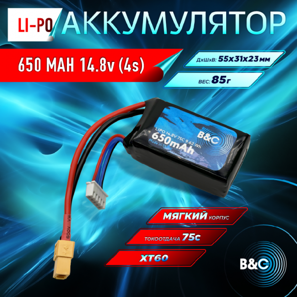 Аккумулятор B&C LiPo 650мАч 4S(14,8V) 75С, XT60, Soft case