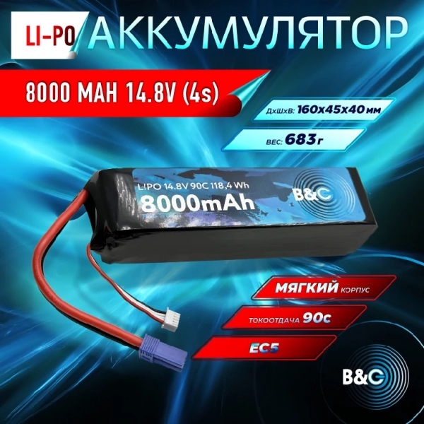 Аккумулятор B&C LiPo 14.8v 8000мАч 90C (4S, Softcase, разъём EC5)