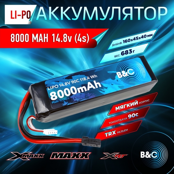 Аккумулятор B&C LiPo 14.8v 8000мАч 90C (4S, Softcase, разъём TRX)