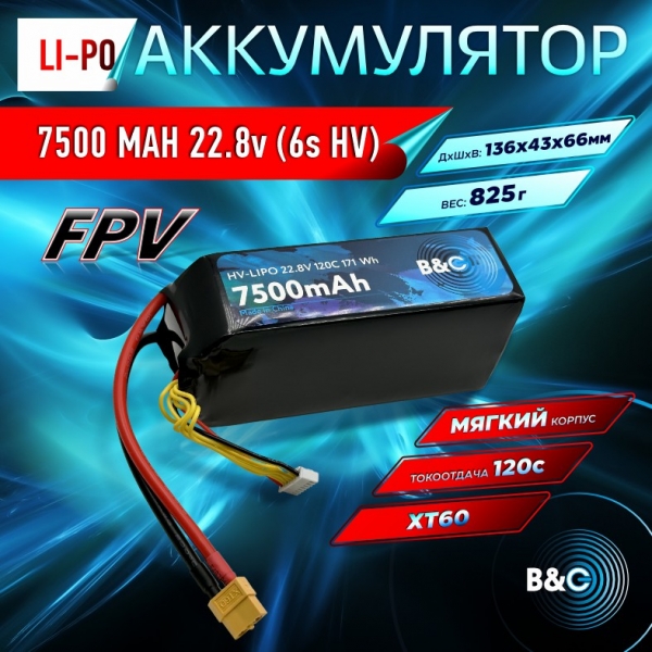 - аккумуляторная батарея B&C LiPo 7500 MAH 22.8v (6s HV), 120С, XT60, Softcase