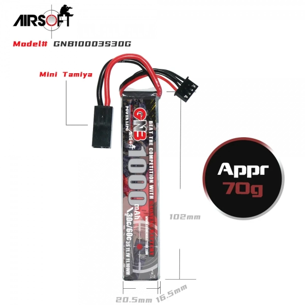 Аккумулятор для страйкбольного оружия GNB 1000MAH 3S1P 11.1V 30С/60C Mini Tamiya Soft Case