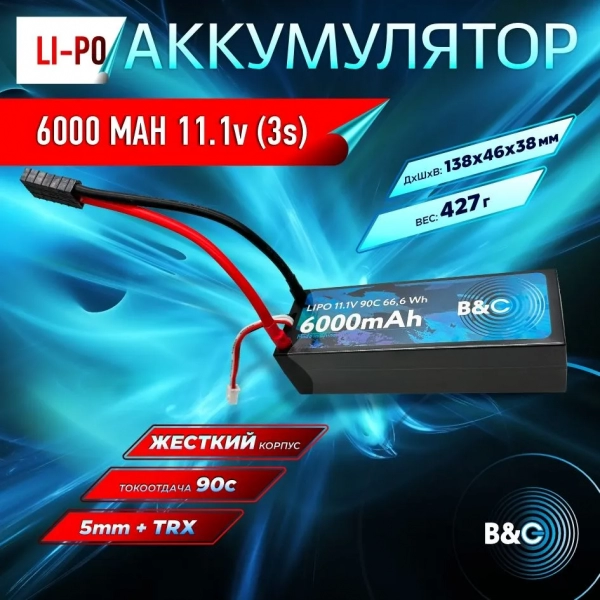 Купить аккумулятор LiPo B&C - 11.1v 6000мАч 90C (3S, Hardcase, разъём Bullet 5.0 мм + TRX)