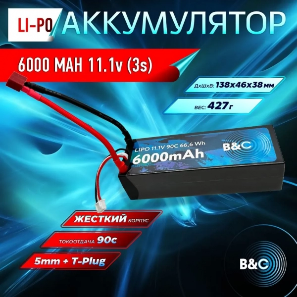 Аккумулятор LiPo B&C - 11.1v 6000мАч 90C (3S, Hardcase, разъём Bullet 5.0 мм + TPlug)