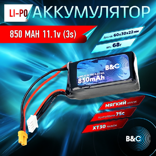 - аккумуляторная батарея LiPo B&C - 11.1v 850мАч 75C (3S, Softcase, разъём XT30)