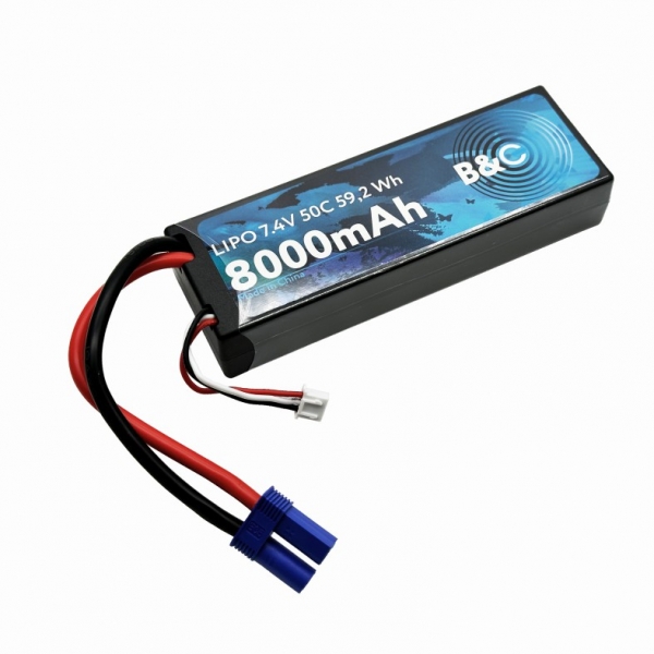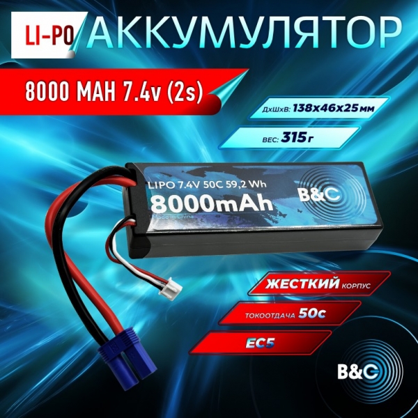 Аккумулятор LiPo B&C - 7,4V 8000МАЧ 50C (2S, Hardcase, EC5)
