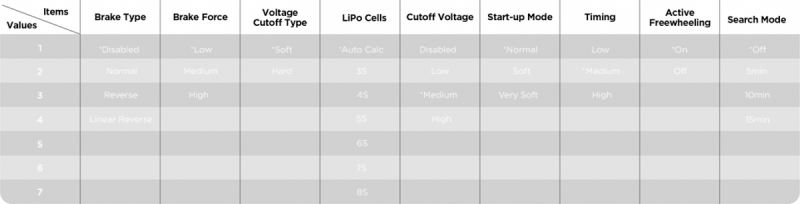 - BEC: переключаемый: 5V/6V/7.4V/8.4V,10A/30A;