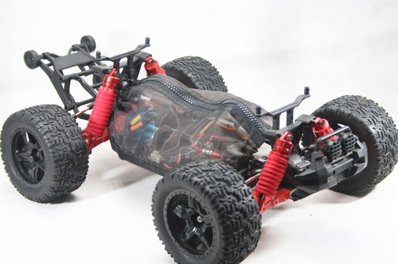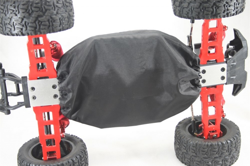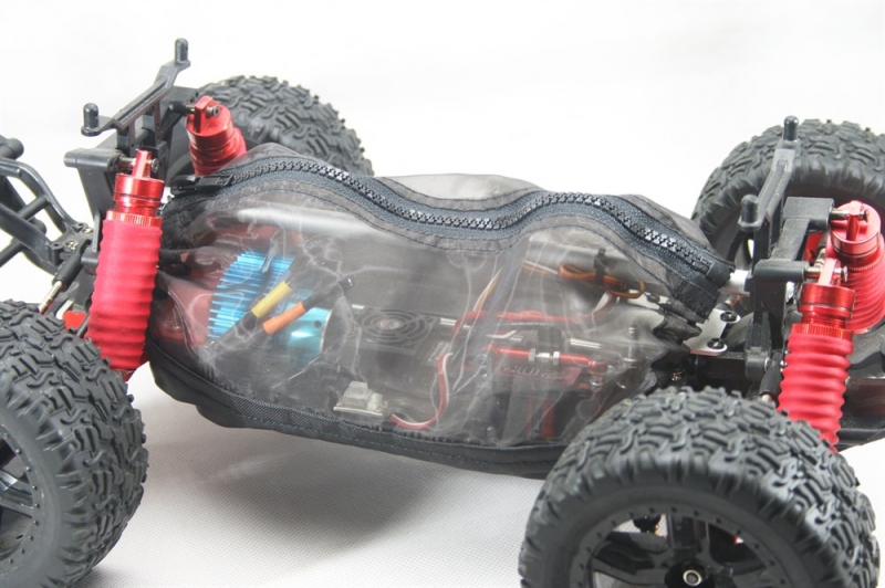 Практичный, чехол на шасси для радиоуправляемой модели скомбинирован из двух видов тканей: специальной плотной ткани с пропиткой не пропускающей воду и летней продуваемой сеткой.