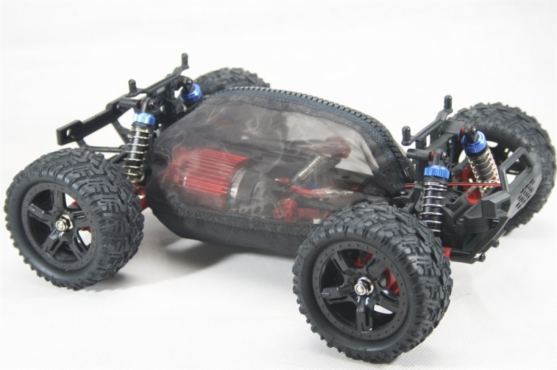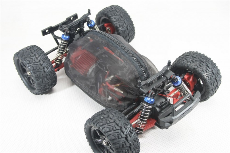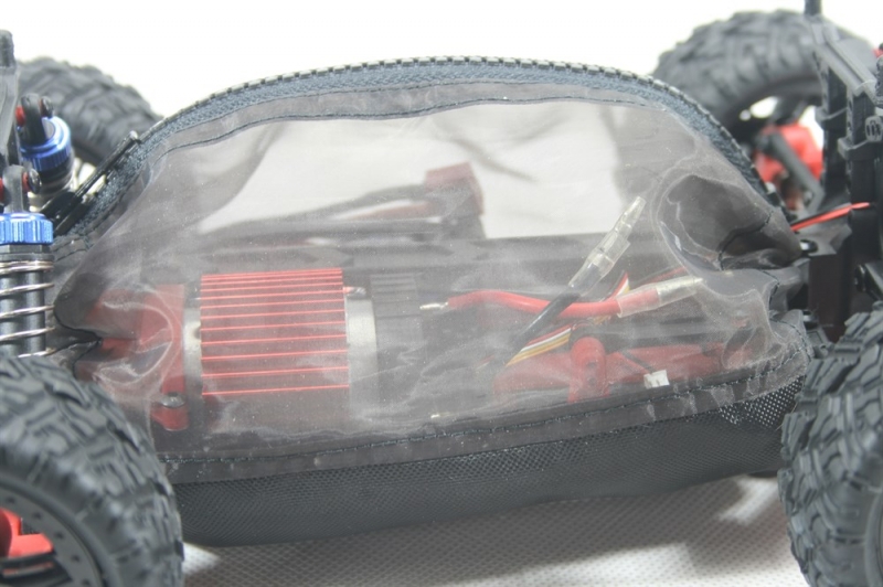 Практичный, чехол на шасси для радиоуправляемой модели скомбинирован из двух видов тканей: специальной плотной ткани с пропиткой не пропускающей воду и летней продуваемой сеткой.
