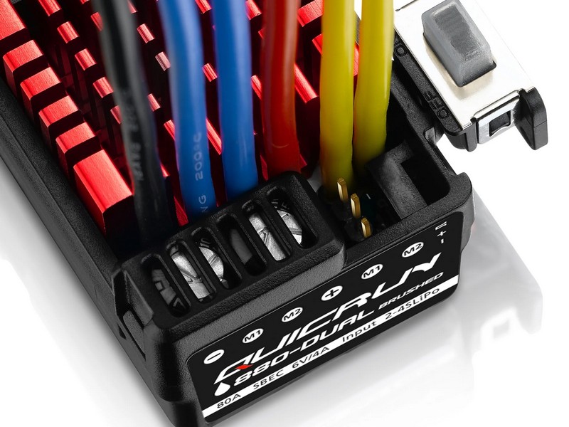 Влагозащищенный регулятор HobbyWing QuicRun WP880 Dual 80А (QuicRun 880-Dual-Brushed) для работы с двумя коллекторными двигателями.