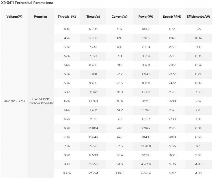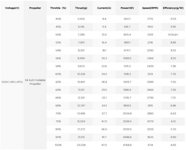 - максимальная тяга: 22 кг/ось (при питании 46V, на уровне моря);