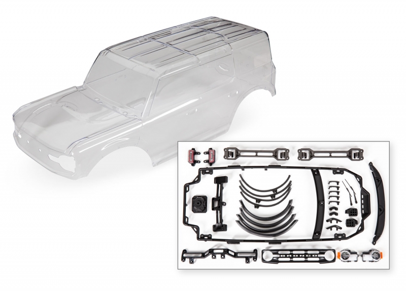 Кузов, Ford Bronco (2021 г.) (прозрачный, требует покраски) / наклейки / маски на окна (включая решетку радиатора, боковые зеркала, дверные ручки, расширители крыльев, дворники, крепление для запасного колеса, крепление без зажимов, крепеж) (требуются внутренние крылья # 8080X)