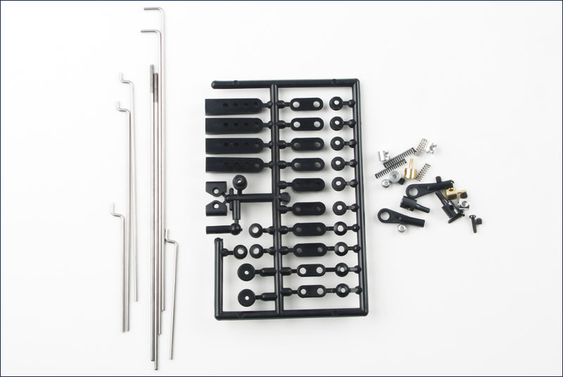 В комплекте: Две Z образные тяги общей длинной 62 мм Две Z образные тяги общей длинной 112 мм Две тяги с резьбой на одном конце, длинной 145 мм Две Г образные тяги общей длинной 150 мм Два шаровых наконечника под шарики 5 мм и два шарика 5 мм Два грибка-стойка с внутренним фиксирующим винтом для качалок, общая высота грибка 10мм., ось грибка 2 мм Два грибка-стойка с внутренним фиксирующим винтом для качалок, общая высота грибка 15 мм., ось грибка 3 мм для качалок Четыре пружинки, две по 10 мм, две по 16 мм, внутренний диаметр 2 мм Четыре стопора пружинок с внутренним фиксирующим винтом тяги, внутренний диаметр 2 мм Комплект пластикового крепежа для сервомашинок