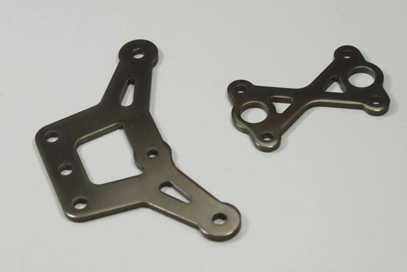 Передняя алюминиевая пластина крепления осей рулевого механизма и пластина крепления тормозного механизма (чёрные).