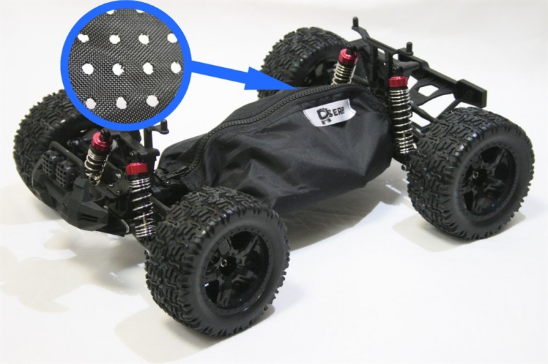 Практичный чехол на шасси для радиоуправляемой модели из специальной ткани с пропиткой не пропускающей воду, а так же с легкой перфорацией (дополнительные отверстия) для оттока тепла вырабатываемого мотором..