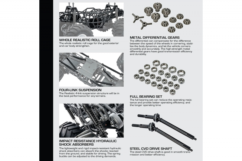 Эта модель монстр-трака имеет целый ряд преимуществ над конкурентами и весьма привлекательную цену, особенно для модели 8го масштаба! Копийный корпус, мощный каркас безопасности, бесколлекторная система, огромные колеса и впечатляющий запас проходимости - вот лишь часть того, что ждет каждого владельца этого монстра!