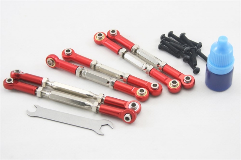 Тюнинг комплект регулируемых тяг на всю машину (6 шт.) с алюминиевыми наконечниками и стальной сердцевиной + ключ + фиксатор, для радиоуправляемых моделей Remo Hobby 1/10 и 1/8 (цвет красный).