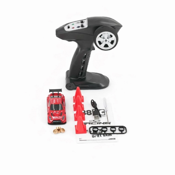Радиоуправляемая машина для дрифта с гироскопом Nissan GTR - RC43-G2-RED. Модель имеет полный привод, пропорциональное управление и выполненна в масштабе 1:43. Управление осуществляется при помощи передатчика, работающего на частоте 2,4 ГГц. В наборе также поставляются комплект запасных колес, дорожные конусы, зарядное устройство и аккумулятор. Во время движения у модели светятся фары.
