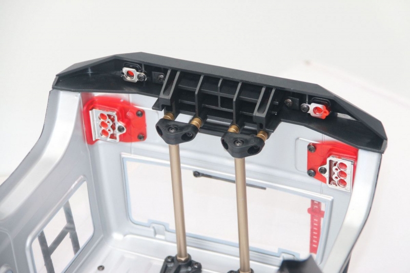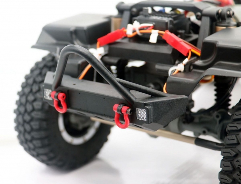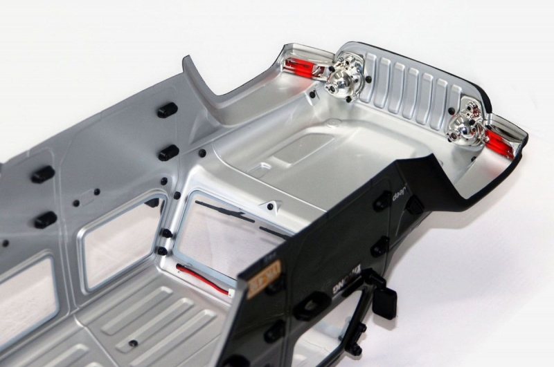 Модель укомплектована хорошо детализированным окрашенным кузовом из поликарбоната с отражателями и светоблоком, установлен багажник и запасное колесо.