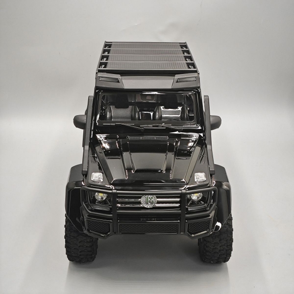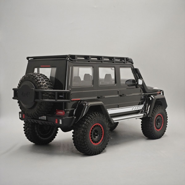 - Модель оснащена реалистичным кузовом из поликарбоната Benz G500 с пластиковыми элементами декора, такими как зеркала, шноркель, багажник на крышу и креплением функционального запасного колеса. По желанию можно обрезать бампер на кузове как указанно в мануале и установить пластиковый силовой. Модель оснащена светоблоком к которому подключены диоды установленные спереди в фары и багажник а сзади в фонари на кузове и бампер, всем светом установленным на модель можно управлять с пульта. Кузов G500 имеет меленькие свесы, что сильно ценится на бездорожье.