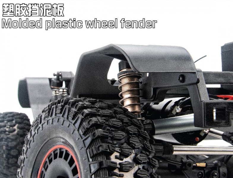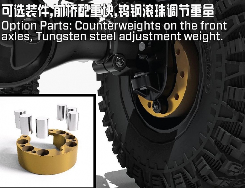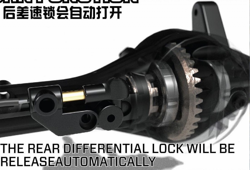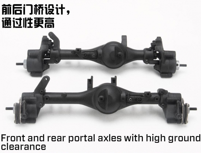 Главное преимущество моделей Yikong относительно остальных моделей масштаба 1:10 - портальные мосты подключаемыми блокировками дифференциалов. Портальный мост позволяет значительно увеличить клиренс без увеличения размеров покрышек за счет подъема самого моста относительно оси колеса.