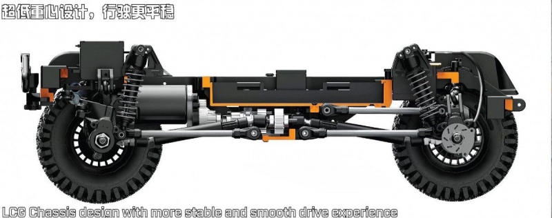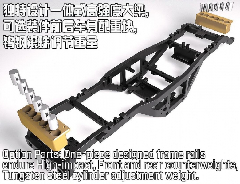 - Новая рама выполненная и высокопрочного пластика с уникальной геометрией для максимально низкого центра тяжести. Все компоненты: Новый Gearbox ( 2-х скоростная трансмиссия с раздаточной коробкой ) является одним целым и спроектирован для максимального снижения центра тяжести, регулятор, и сервоприводы управления и тормоза заднего моста установлены внутри рамы. Над Трансмиссией располагается новый батарейный отсек с адаптером для батарей разной длинны. для настройки развесовки можно использовать опциональные грузы которые продаются отдельно.
