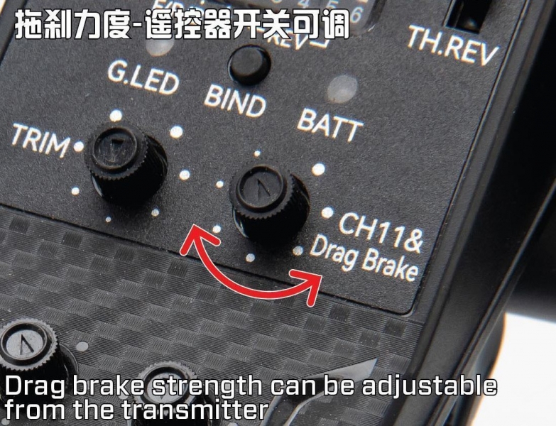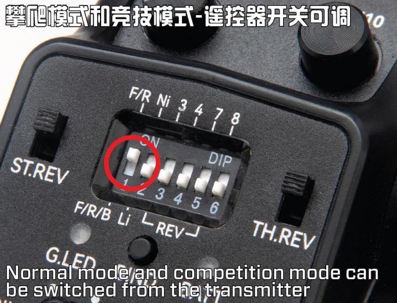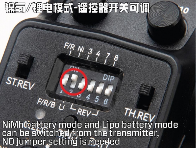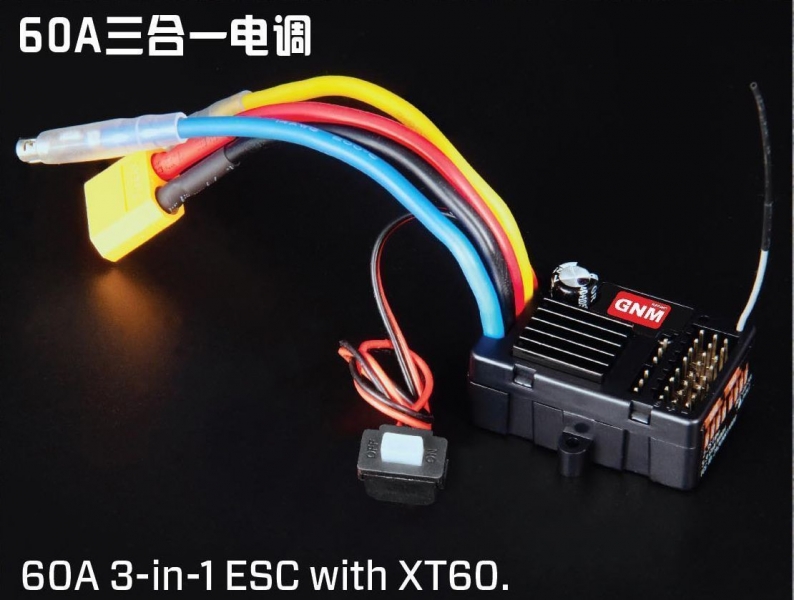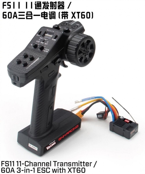 - Радиоаппаратура FS11 имеет 11 каналов управления, и приёмник совмещённый с 60А регулятором оснащенный влагозащитой и силовым разъёмом XT60. Настройка регулятора с пульта управления: на пульте установлены переключатели с помощь которых можно настроить режимы (Normal mode / Competition mode) - Движение вперёд и назад без тормоза или с тормозом, переключать тип батареи NiMh / LiPo (перемычка не требуется), функция Drag Brake настраивается так же с пульта.