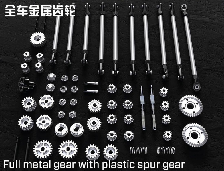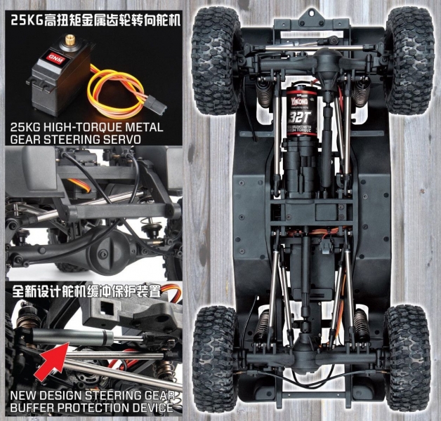- Модель Yikong 4106PRO оснащена алюминиевыми амортизаторами, полным комплектом подшипников, все шестерни и тяги выполнены из метала. Стальные привода с крестовинами обеспечивающие максимальный выворот колёс до 46°.