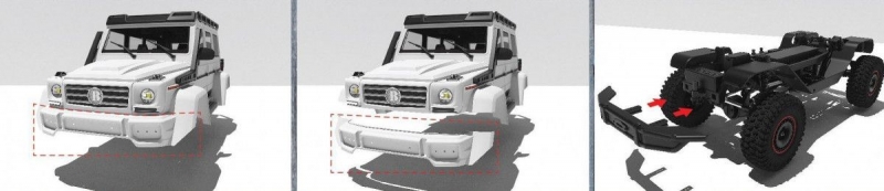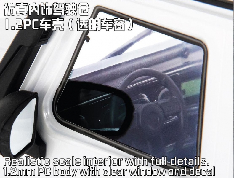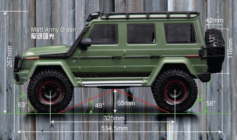 - Модель оснащена реалистичным кузовом из поликарбоната Benz G500 с пластиковыми элементами декора, такими как зеркала, шноркель, багажник на крышу и креплением функционального запасного колеса. По желанию можно обрезать бампер на кузове как указанно в мануале и установить пластиковый силовой. Модель оснащена светоблоком к которому подключены диоды установленные спереди в фары и багажник а сзади в фонари на кузове и бампер, всем светом установленным на модель можно управлять с пульта. Кузов G500 имеет меленькие свесы, что сильно ценится на бездорожье.