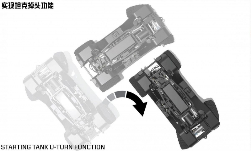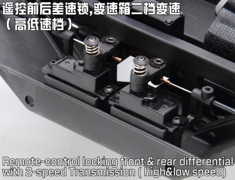 - Новые портальные мосты имеют другую форму ореха, что придаёт им более реалистичный внешний вид. В новой конструкции рамы используется тяга панара на обоих мостах. Тяга панара нужна для уменьшения перемещения моста в поперечной плоскости под воздействием направленной вбок силы от сервопривода, а так же для уменьшения карданного эфекта. Блокировки дифференциалов управляются так же как и на предыдущих версиях, с помощью сервоприводов. Главное отличие заключается в заднем мосту! Модель оснащена функцией "TANK TURN" так называемый танковый разворот. На задний мост установлены дисковые тормоза, которые блокируют 1 из колёс, что позволяет модели разворачиваться вокруг одного из задних колёс. Эта функция увеличивает маневренность в ограниченном пространстве.
