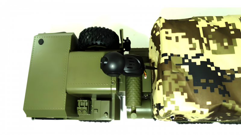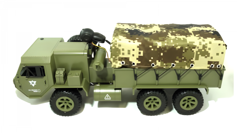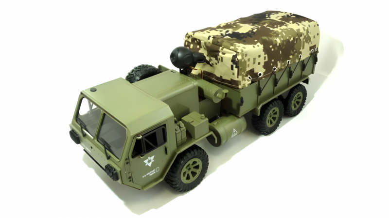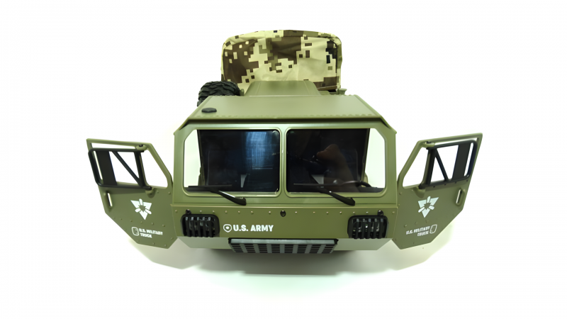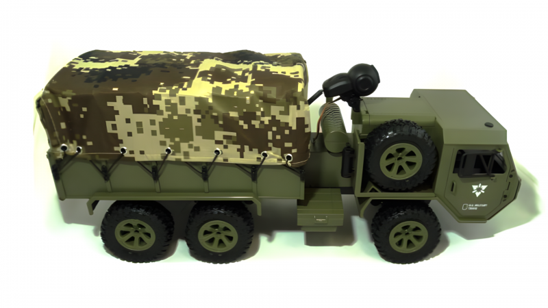 Радиоуправляемый американский военный грузовик 6WD имеет полный привод и большие резиновые колеса, что позволяет ему легко преодолевать самые разные препятствия. Проработанная подвеска позволяет нагружать его тяжелыми грузами. Открывающиеся двери позволяют посадить за руль водителя и добавить интереса к игре.
