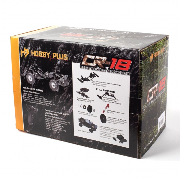 Микро краулер от компании HobbyPlus CR-18 в масштабе 1/18, предназначена для Трофи-Рейдов на самых маленьких трассах, можно использовать хоть дома, хоть на улице. Комплектация RTR позволит вам ознакомиться с моделью на трассе без траты времени на сборку. Если вам нравятся радиоуправляемые модели, но нет возможности выбраться на улицу, микро модель не даст вам скучать в домашних условиях. Вы сможете с лёгкостью преодолевать бездорожье, покорять горы и не проходимые болота. Модель оснащена влагозащитой. Правильная развесовка модели поможет вам в покорении крутых подъёмов и спусков, высокий клиренс и большой ход подвески поможет вам при езде бездорожью. Модель полным приводом 4х4.