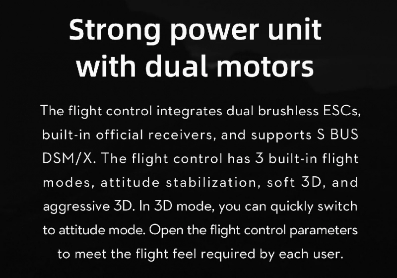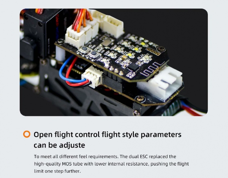 - ESC: два отдельных электронных регулятора хода улучшены за счет использования высококачественных MOSFET-транзисторов с меньшим внутренним сопротивлением, что еще больше улучшает летные характеристики;
