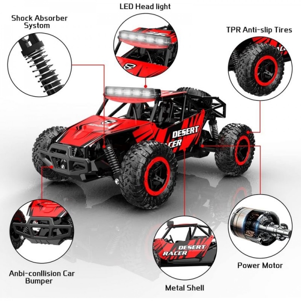 Аппаратура управления с передовой технологией FHSS 2,4 ГГц обеспечивает большой диапазон управления и хорошую защиту от помех. Это позволяет участвовать в гонках одновременно более 20 радиоуправляемым моделям. Это отличный игрушечный внедорожник для вас и ваших друзей, семьи, чтобы весело провести время в помещении или на улице.