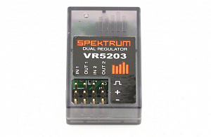 Регулятор напряжения VR5203 обеспечивает защиту и регулировку напряжения по двум каналам. Предназначен для использования в первую очередь для вертолетов с гироскопом. Большинство брендов гироскопов/сервоприводов рулевого винта имеют ограничения по напряжению 6 вольт или меньше. Регулятор VR5203 устанавливается между приемником и гироскопом и регулирует напряжение, подаваемое на гироскоп и сервопривод рулевого винта 5,2 вольта. Это позволяет остальным компонентам работать от более высокого напряжения батареи (обычно 5-элементной NiMH 6 вольтовая батарея или даже 2-элементная LiPo 7,4 вольт). Спецификация: 2 входа обеспечивают возможность подключения устройств с более низким напряжением. 2 выхода распределяют нагрузку на два разъема для минимизации падения напряжения батареи. Вход напряжения: от 5.5 до 10 вольт. Постоянный ток: 2 А (3 А пиковая). Он не предназначен для установки между аккумуляторной батареей и приемником для питания всей системы. Технические характеристики: тип: двойной вход/выход, входное напряжение: от 5.5 до 10 вольт (4-8-элементный NiCd/NiMH или 2-элементный LiPo), выходное напряжение: 5.2 вольт, постоянный ток: 2.0 А (3 А пиковое), размер: 23x32x12 мм, вес: 7 г.
