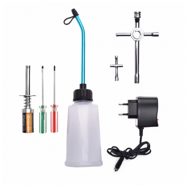 В комплекте набора имеются необходимые аксессуары и инструменты, которые могут потребоваться во время запуска автомодельного калильного двигателя внутреннего сгорания.