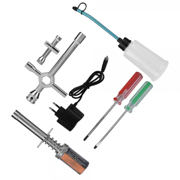 В комплекте набора имеются необходимые аксессуары и инструменты, которые могут потребоваться во время запуска автомодельного калильного двигателя внутреннего сгорания.