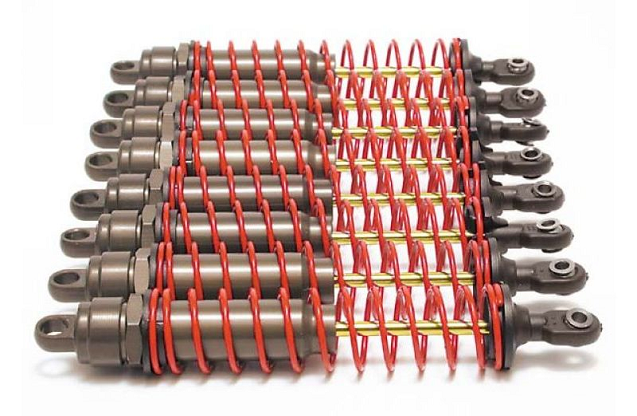 Усиленные амортизаторы в сборе, длинные, с пружиной красного цвета, корпус алюминий Т6 с тефлоновым покрытием, штоки TiN, 8 штук. Опция для автомоделей Traxxas серии REVO 3.3, T-MAXX 3.3, T-MAXX, RUSTLER VXL, E-MAXX.