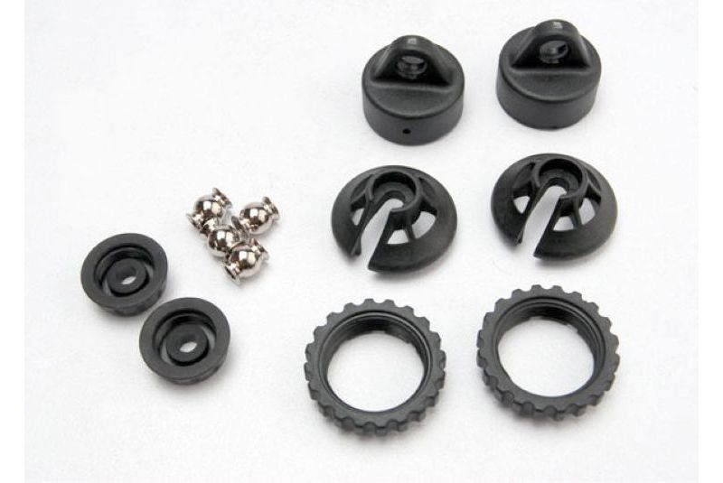 Пластиковые запчасти для амортизаторов TRAXXAS GTR (верхние крышки амортизаторов, нижние крышки амортизаторов, нижние чашки опоры пружин, регулировочные гайки по 2шт). Устанавливается на модели TRAXXAS: XO-1, E-Revo, Summit, Revo 3.3, Jato 3.3.