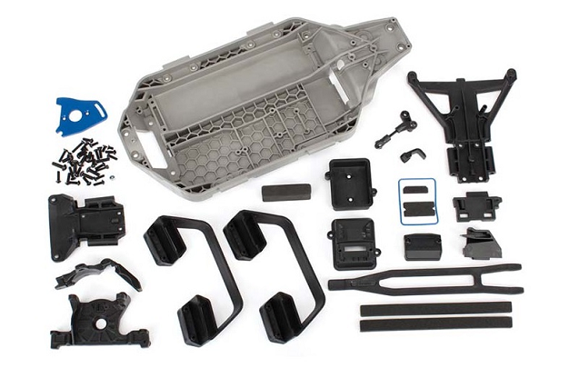 Набор для конверсии TRAXXAS Slash 4x4. Включает новое шасси с пониженным центром тяжести, защитные рамки, алюминиевую мотораму, зажим для батарейного отсека, радиобокс, дополнительные пластиковые детали и набор крепежа.