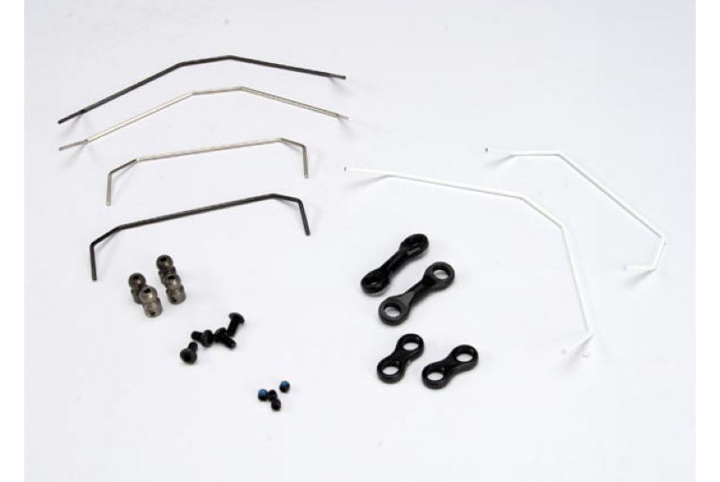 В комплект входят 3 стабилизатора различной жесткости для переднего моста, 3 стабилизатора различной жесткости для заднего моста, клипсы фиксации стабилизаторов на рычагах, винты крепления на корпусе модели.