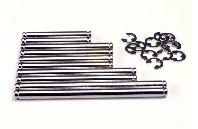 SUSPENSION PIN SET, HARD CHROM Комплект осей рычагов, металл/хром с Е-образными стопорными кольцами, 10 штук. Подходят для автомоделей Traxxas серии NITRO STAMPEDE. Опция для автомоделей Traxxas серии NITRO RUSTLER, NITRO SPORT.