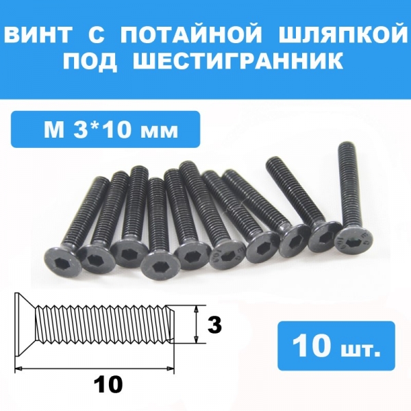 Комплект винтов М3*10мм (10шт) с потайной шляпкой под шестигранник.