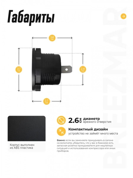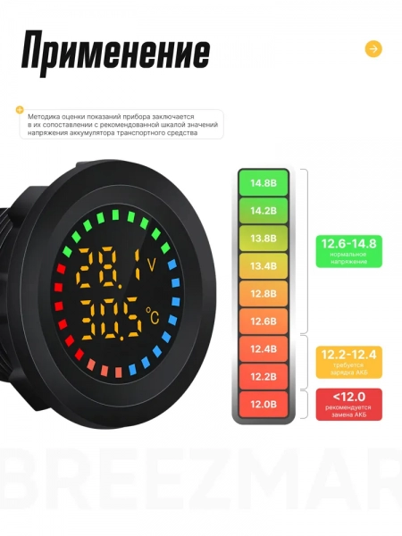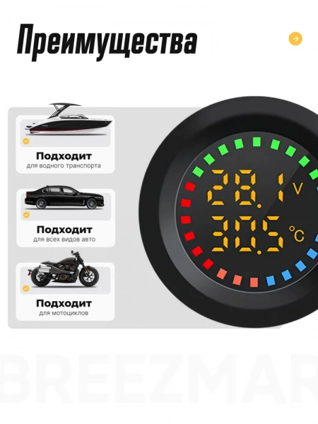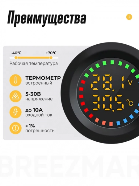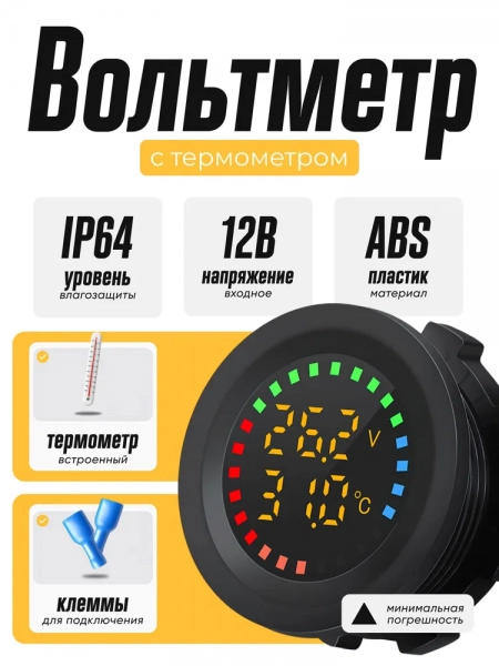 Врезной вольтметр с градусником, влагозащитный для лодок и авто, контроль напряжения аккумулятора 5 - 30 В, подсветка синяя со шкалой измерения
