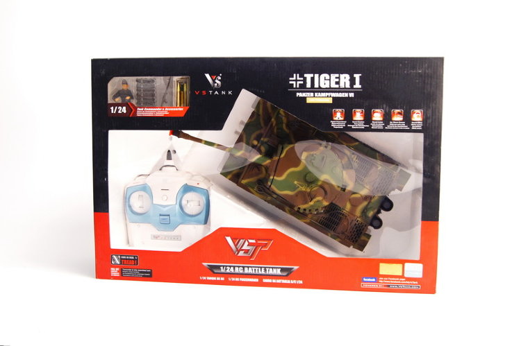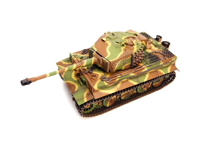 Данная радиоуправляемая модель, выполненная в масштабе 1:24, предельно точно копирует танк нацистской Германии Тигр поздней модификации. Каждой гусеницей танка можно управлять отдельно, осуществляется также поворот башни и подъем пушки, позволяющей участвовать в танковом сражении. Кроме того, эта боевая техника оборудована пневматической пушкой, стреляющей пластиковыми шариками.