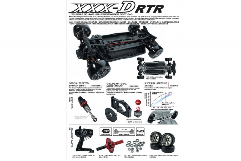 Но пусть вас не смущает начальный уровень модели. XXX-D RTR может быть легко модернизирована до уровня PRO или VIP, а также стать настоящей машиной для дрифта. Другими словами, вы покупаете наиболее доступную XXX-R RTR версию начального уровня, а затем, по мере необходимости или желания, докупаете тюнинг и делаете из нее PRO или VIP версию. Потребуется лишь немного терпения, практики, и XXX-D превратится в модель профессионального уровня!