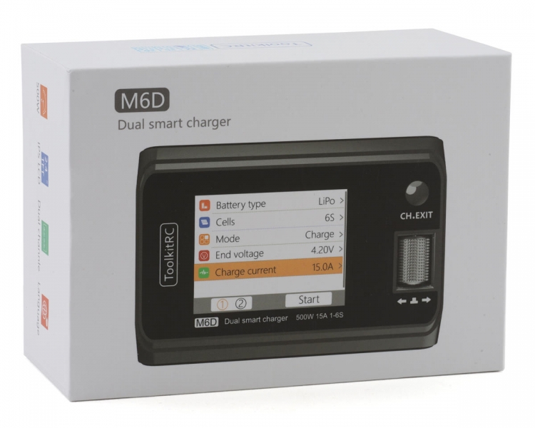 ToolkitRC M6D — мощное (500 Вт) двухканальное зарядное устройство с 2,4-дюймовым ЖК-экраном. Отличный выбор, если нужно заряжать несколько аккумуляторов.