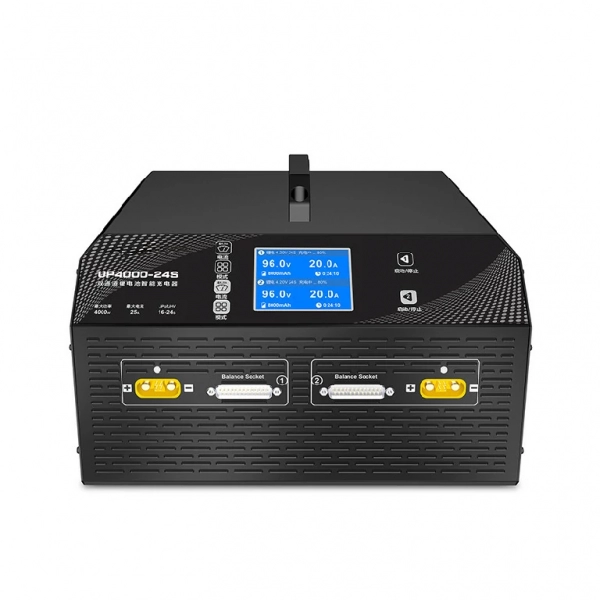 Ultra Power UP4000-24S - это зарядное устройство с двумя каналами, предназначенное для высокомощной зарядки аккумуляторных батарей LiPo и LiHV с количеством ячеек от 16 до 24S. Оно обеспечивает до 4000 Вт на канал при питании от сети переменного тока 220В с максимальным зарядным током 25A на канал. 3,2-дюймовый ЖК-дисплей предоставляет данные о зарядке в реальном времени.