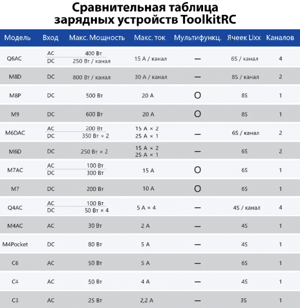 Артикул: TK12000Зарядное устройство ToolkitRC Q4ACToolkitRC Q4AC — четырехканальное зарядное устройство для Li-Po (1-4 банок), NiMh (1-10 банок) и Pb (1-8 банок) . Имеет встроенный блок питания на 100 Вт (можно запитывать от сети 220 В) и входной порт для постоянного тока до 200 Вт.