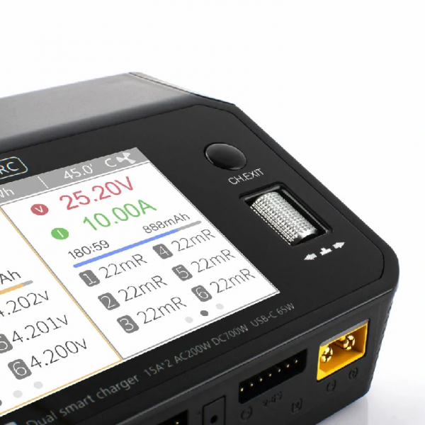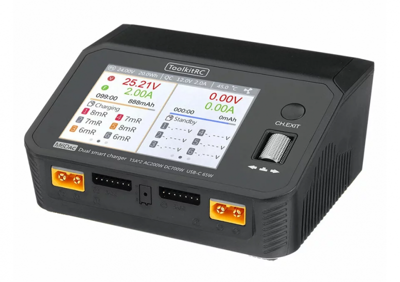 ToolkitRC M6DAC — двухканальное интеллектуальное зарядное устройство для LiPo аккумуляторов 1-6S (а также LiHV, LiFe, Lion, NiMh, Pb аккумуляторов). Имеет встроенный блок питания на 200 Вт, поэтому способно работать от сети 220В.