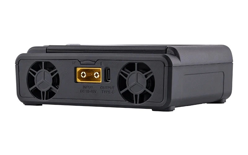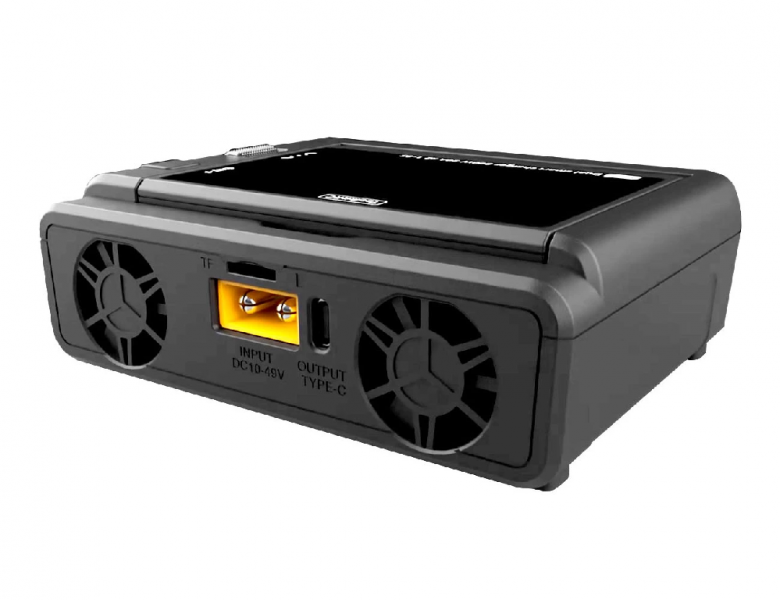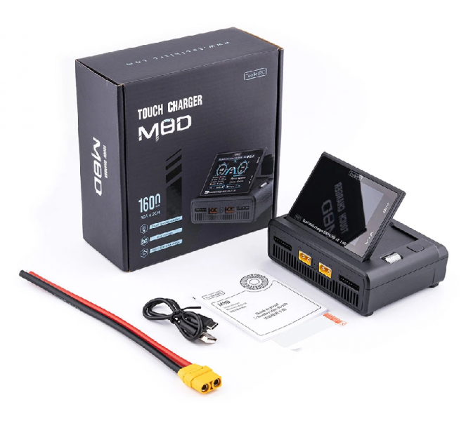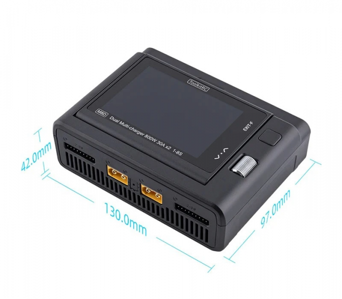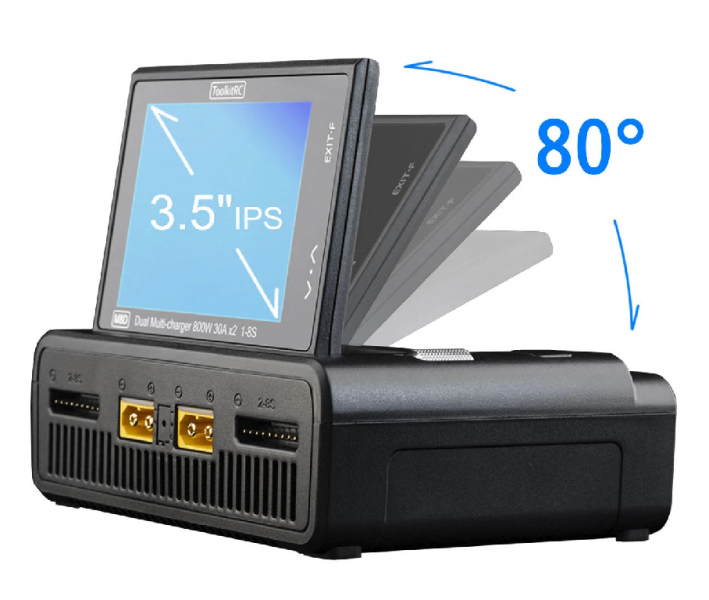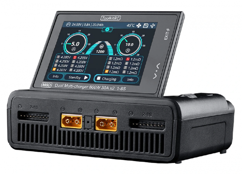 ТoolkitRC M8D — интеллектуальное двухканальное зарядное устройство с сенсорным экраном для 1-8S аккумуляторов. Максимальная мощность составляет 1600 Вт, есть функция быстрой зарядки 65 Вт через USB-C порт. Экран имеет регулируемый угол наклона от 0° до 80°.